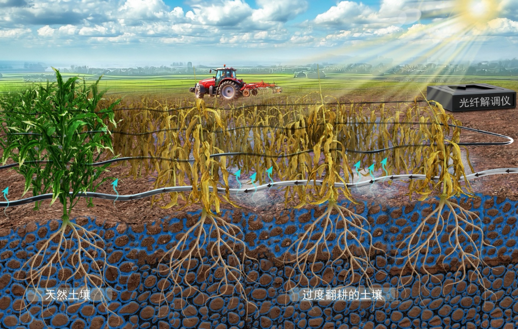 中国科学院地质与地球物理研究所联合国际团队利用分布式光纤传感技术(DAS),在分钟级尺度上实时监测农田土壤结构的动态变化。这项交叉研究为理解土壤-植物关系提供了新视角,未来结合光纤传感与人工智能技术,有望支持规模化、精细化的农业管理。