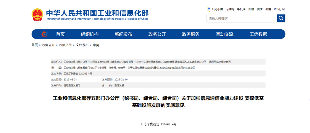 2月10日,工业和信息化部、中央网信办、中央空管办、国家发展改革委、中国民航局等五部门联合印发《关于加强信息通信业能力建设 支撑低空基础设施发展的实施意见》(以下简称《意见》),明确提出要“有序推进低空场景通信网络建设”“辅助提升导航定位精度”“支撑建设低空智能网联系统”。